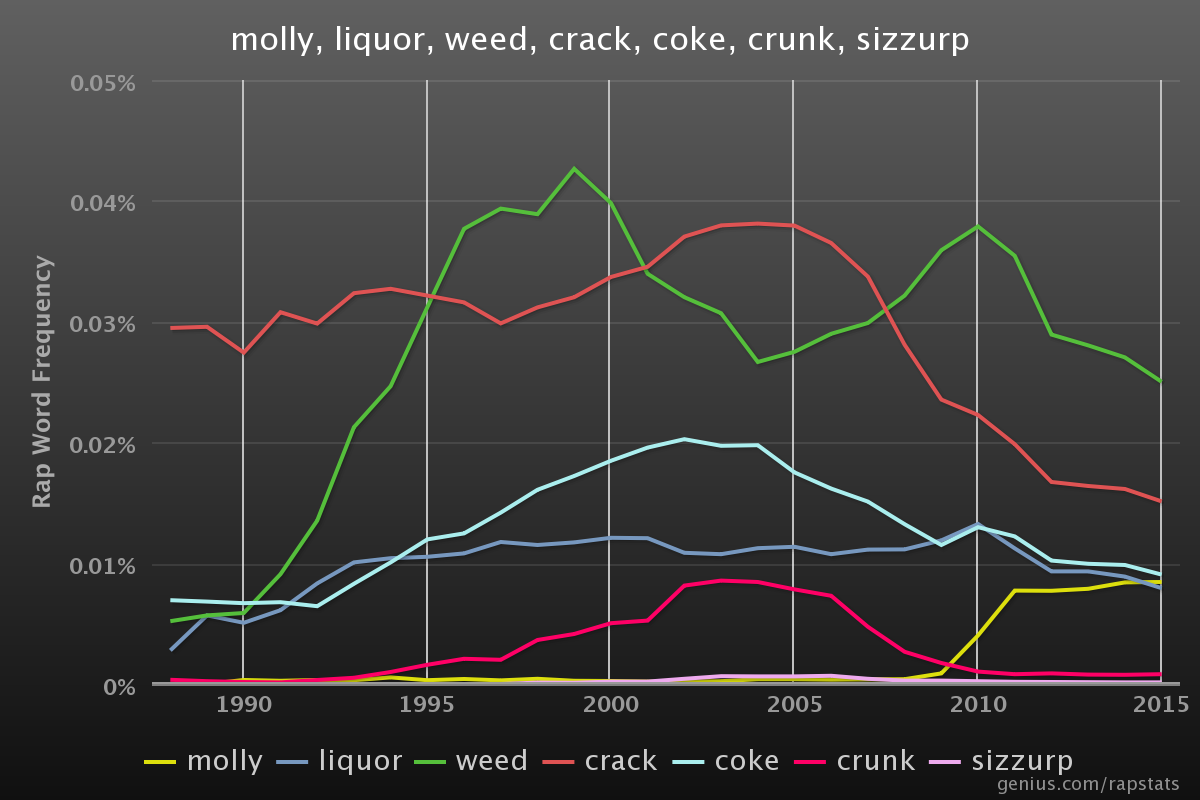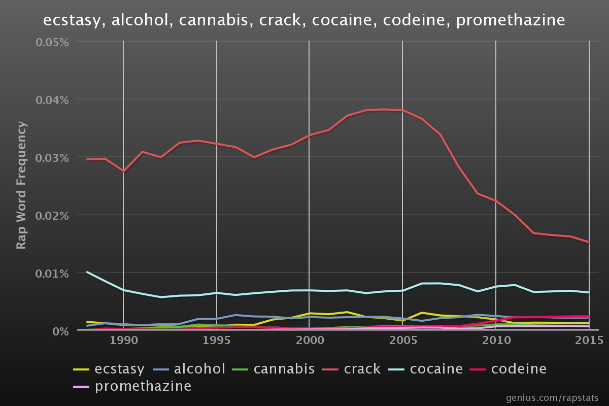 From hip-hop’s conception to current trends, its lyrics have reflected significant shifts in drug culture. This article explores the frequency of word usage of drug terminology in hip-hop lyrics spanning 3 decades of the genre. We explore how and possibly why different lyrical trends have emerged, risen and fallen out of popularity.
